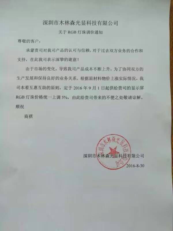 木林森调价通知显示,由于市场的变化,导致产品成本不断上升,为了协同双方的生产发展和保持良好的业务关系,根据原材料物价上涨实际情况。本着互惠互利的原则,定与2016年9月1日起显示屏RGB灯珠价格统一上调5%。