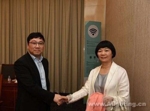 华为消费者业务无线宽带与家庭产品线总裁万飚(左)和欧普照明总裁马秀慧(右)