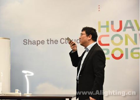 华为消费者业务无线宽带与家庭产品线总裁万飚演示欧普照明新品