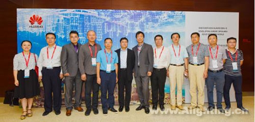 华为消费者业务无线宽带与家庭产品线总裁万飚,欧普照明首席技术官齐晓明,连同美的,Broadlink等高层合影